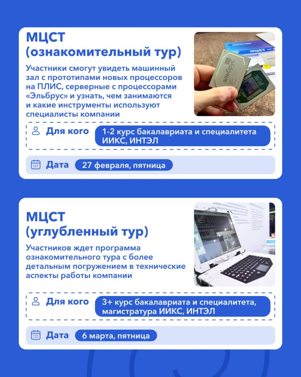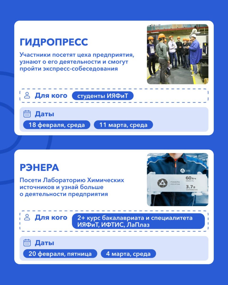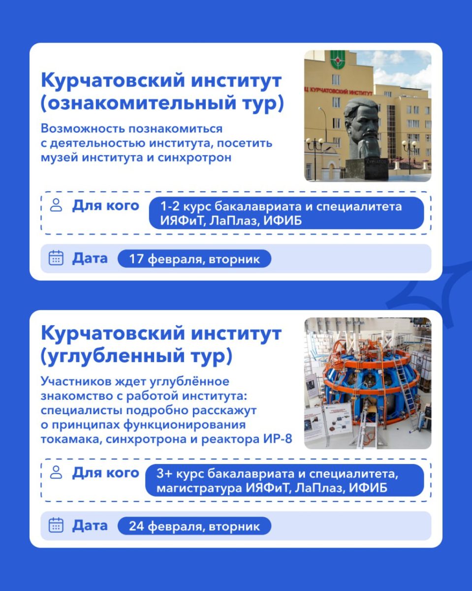 На Telegram-канале Старт карьеры НИЯУ МИФИ анонсирована серия технических туров на ведущие предприятия в феврале и марте. Это уникальный шанс для студентов увидеть реальное производство и потенциальное место работы ещё до начала карьеры.