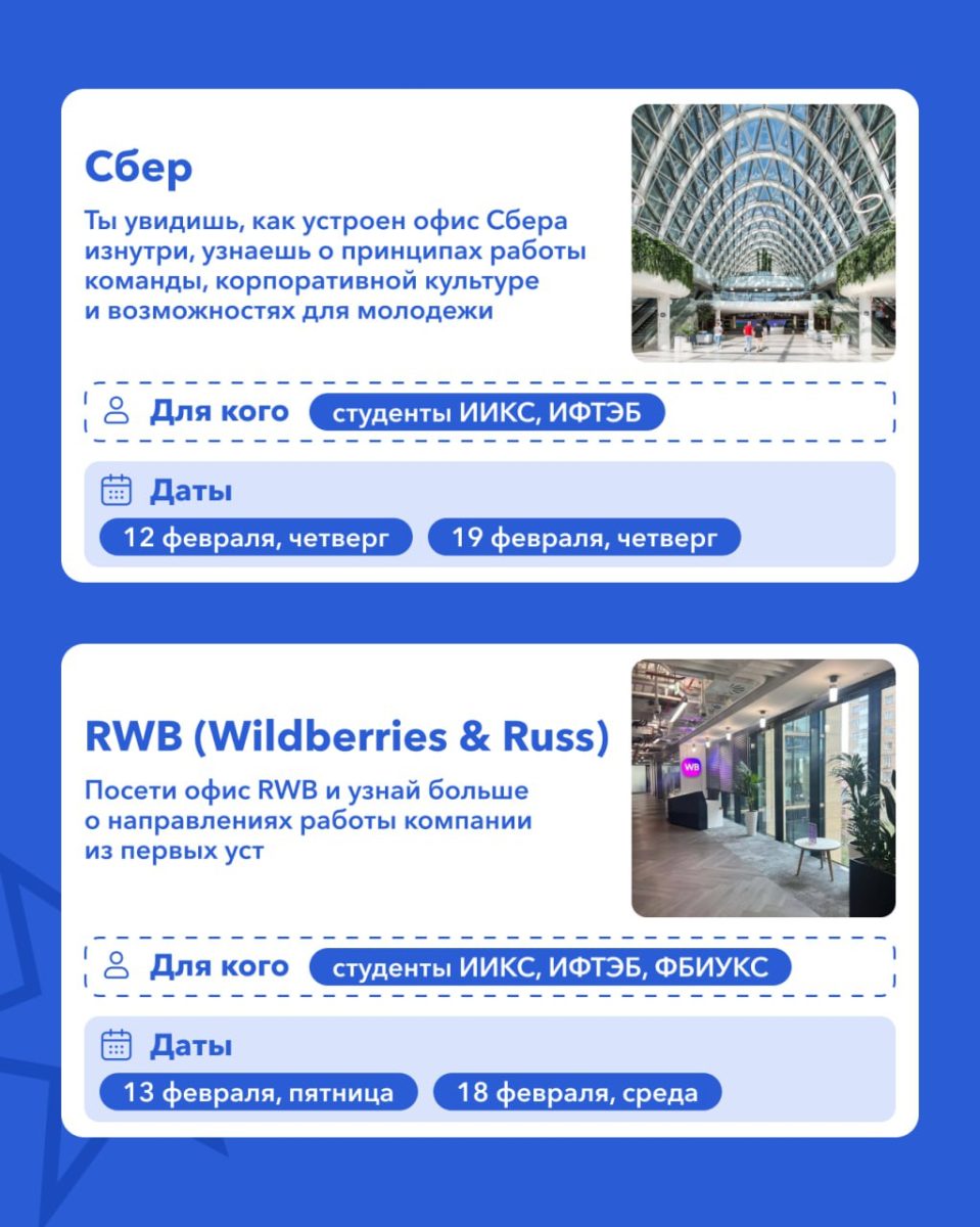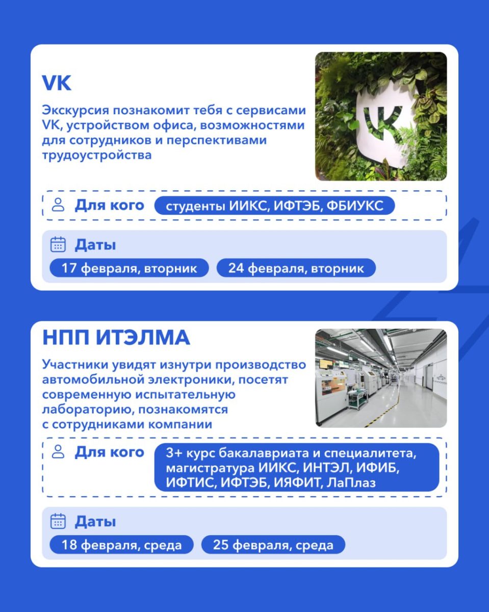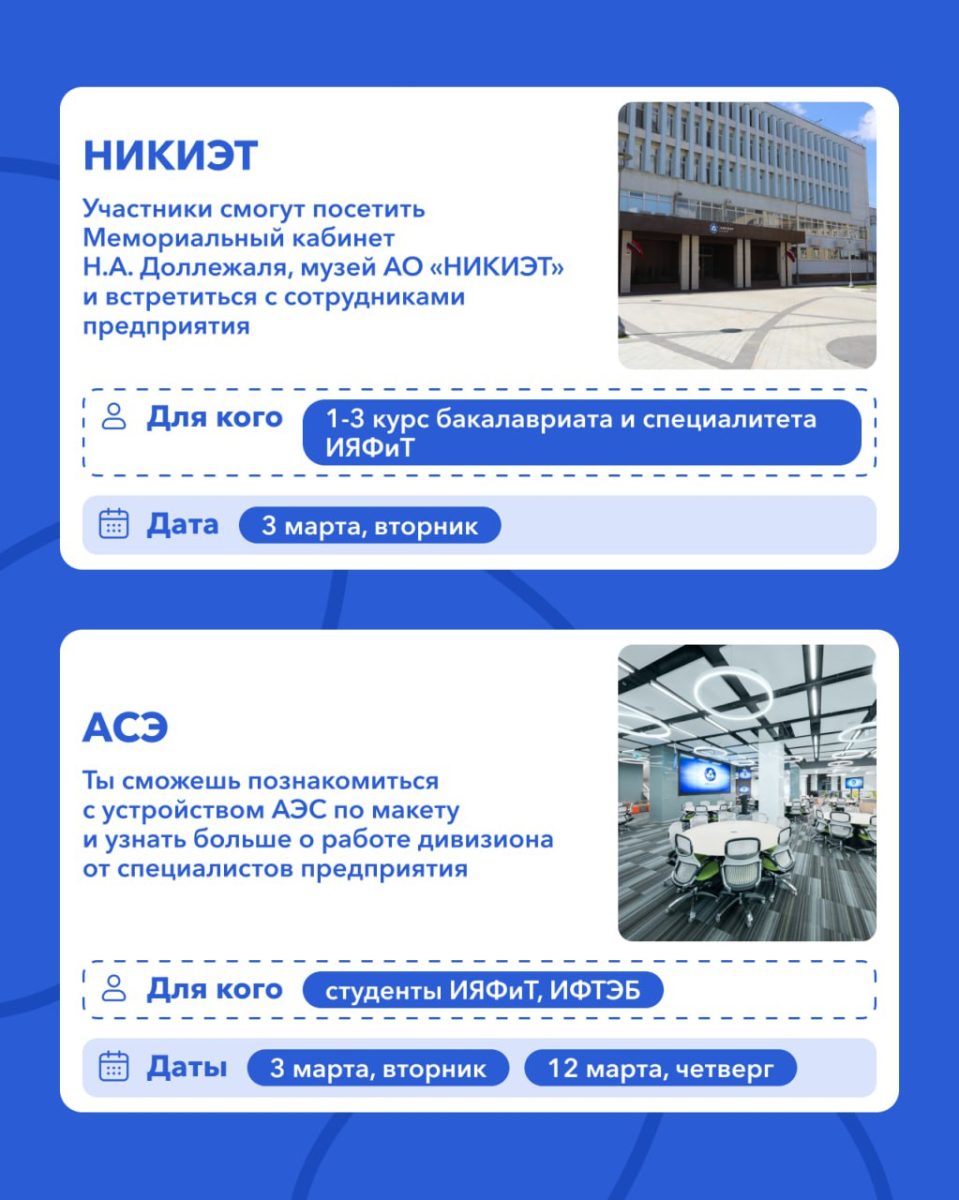 На Telegram-канале Старт карьеры НИЯУ МИФИ анонсирована серия технических туров на ведущие предприятия в феврале и марте. Это уникальный шанс для студентов увидеть реальное производство и потенциальное место работы ещё до начала карьеры.
